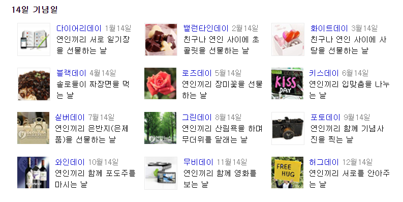 14일 기념일은 초록창에 검색해 뜨는 기념일을 기준으로 합니다.