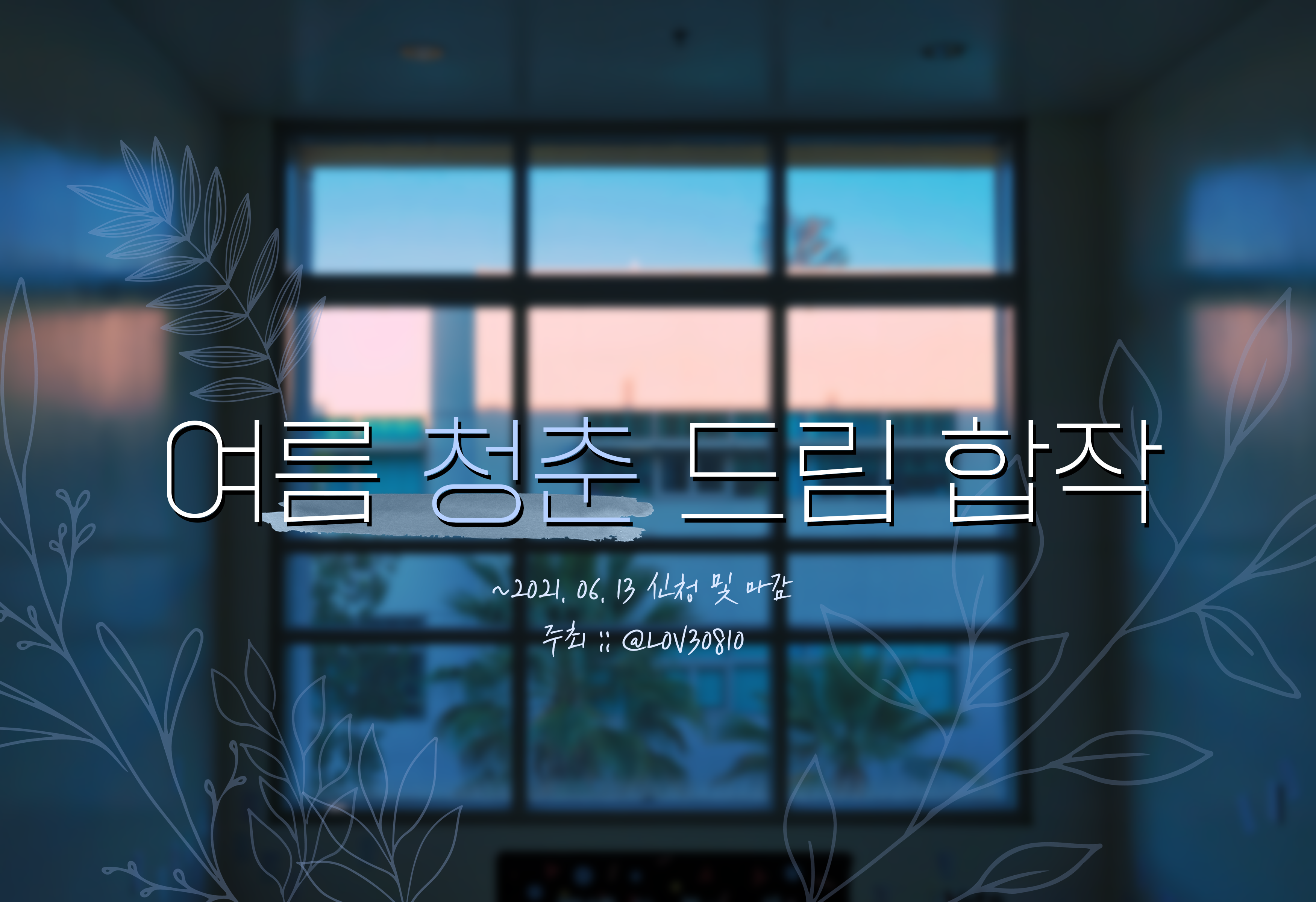 이번 드림합작테마는 " 여름청춘 " 입니다. AU나 본래 세계관 상관없이 신청 가능합니다. 분위기가 현대, 여름, 청춘, 고교, 대학생 등의 분위기가 나면 뭐든 괜찮습니다. (고등학교 기준으로 성인, 미자의 사랑은 금지됩니다.) 되도록 청춘 느낌이 나도록 부탁드리며 이에 관한 문의도 편하게 부탁드립니다.
