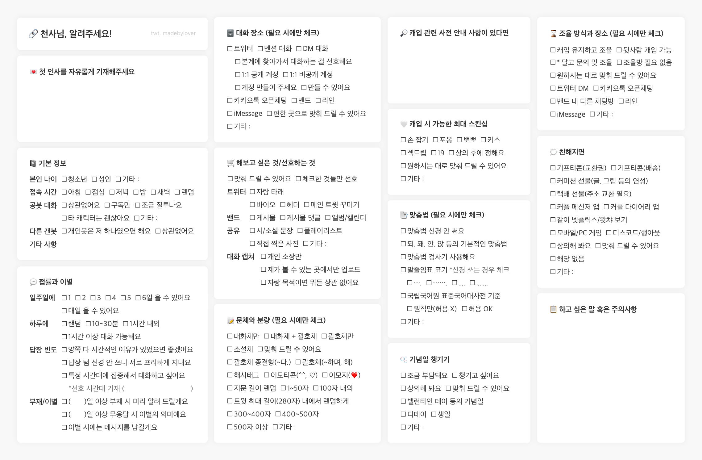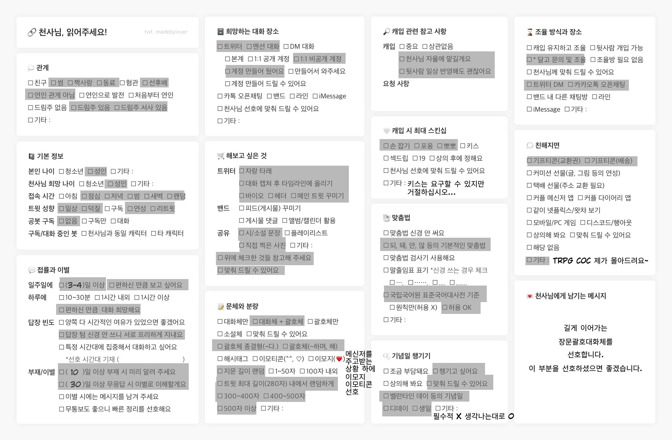 개인봇 갠봇 모심표 시트 ♡ 고화질은 링크에 * 왼쪽 - 오너 작성 https://t.co/33XquCIyhg * 오른쪽 - 천사님 작성 https://t.co/LkYO4whg5w * 그동안 업로드한 표 중 체크박스가 가장 많습니다. 사전 조율을 세